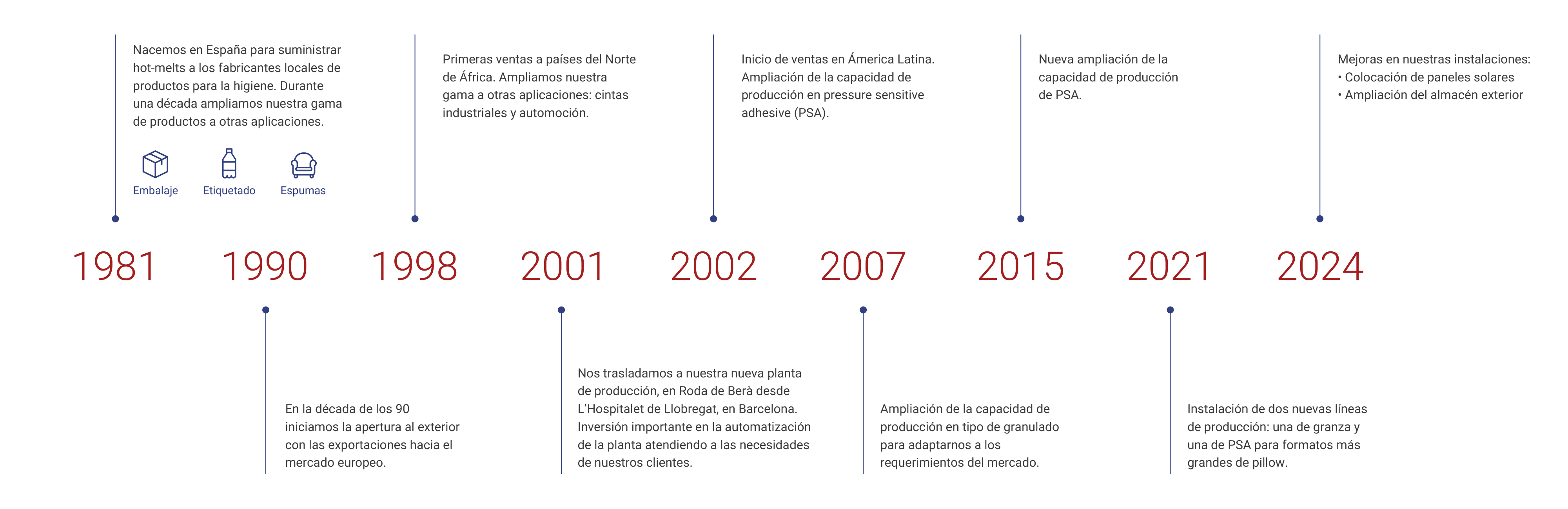 Al fundar la empresa en el año 1981, creamos los primeros hot-melt destinados a los fabricantes de pañales, compresas, y productos para la incontinencia que había en España.