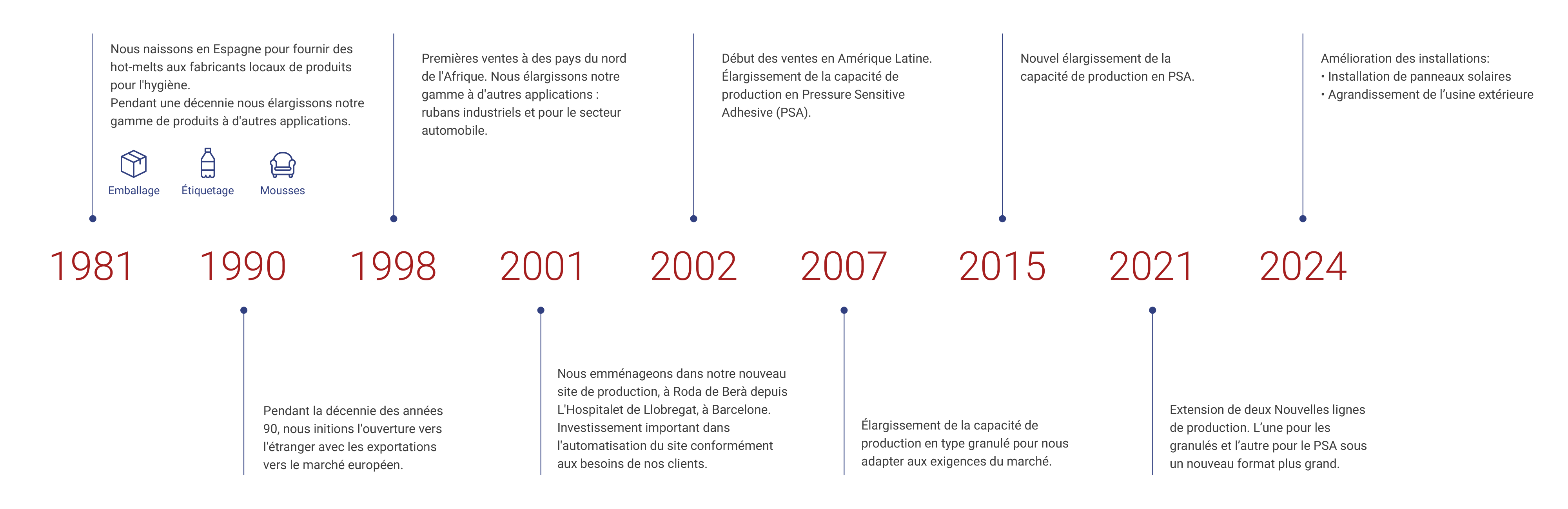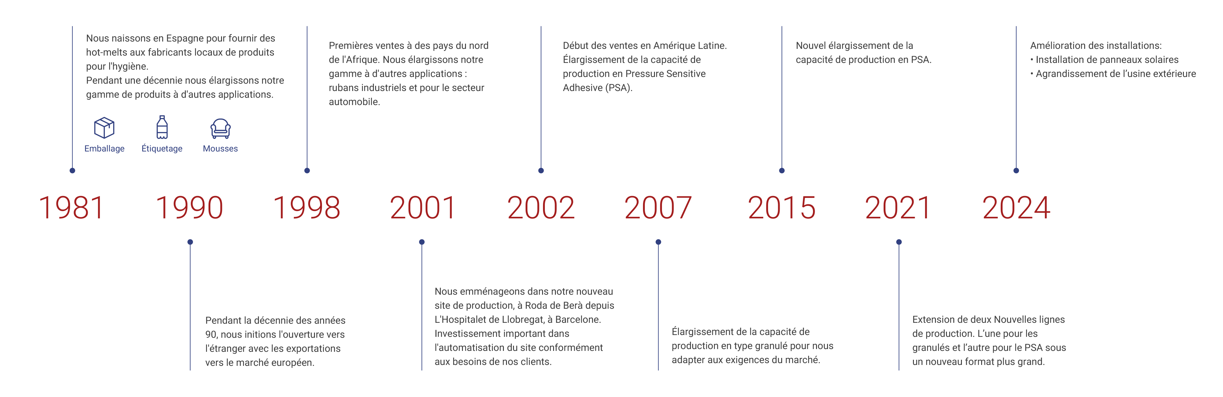 En fondant l'entreprise en 1981, nous avons créé les premiers hot-melts destinés aux fabricants espagnols de couches-culottes, serviettes hygiénique et produits pour l'incontinence.